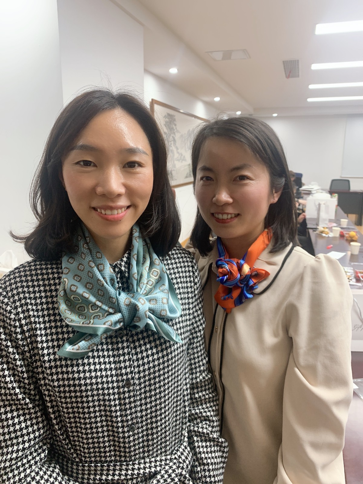 大家快乐地打开“丝巾”盲盒后,一起学习了多种系丝巾方法。大家享受着搭配色彩、设计造型、相互系丝巾带来的乐趣和美好体验,展示着各自的才艺。