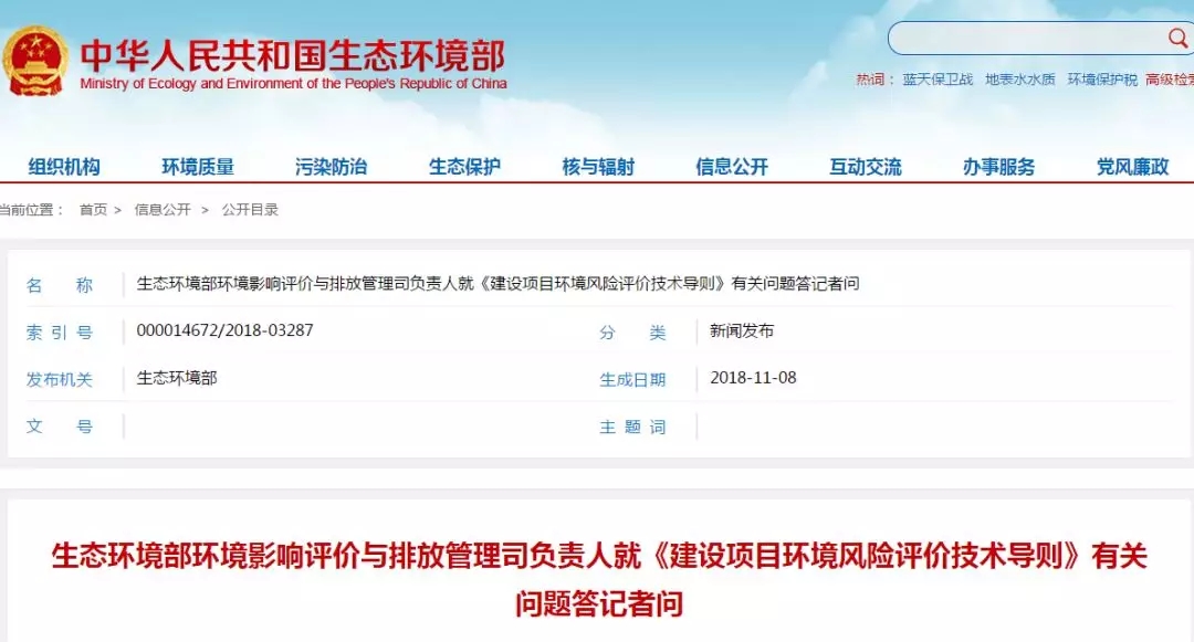 生态环境部日前印发了《建设项目环境风险评价技术导则》(HJ169-2018)(以下简称《风险导则》),生态环境部环境影响评价与排放管理司负责人就《风险导则》修订的背景、思路及内容等有关问题回答了记者的提问。
