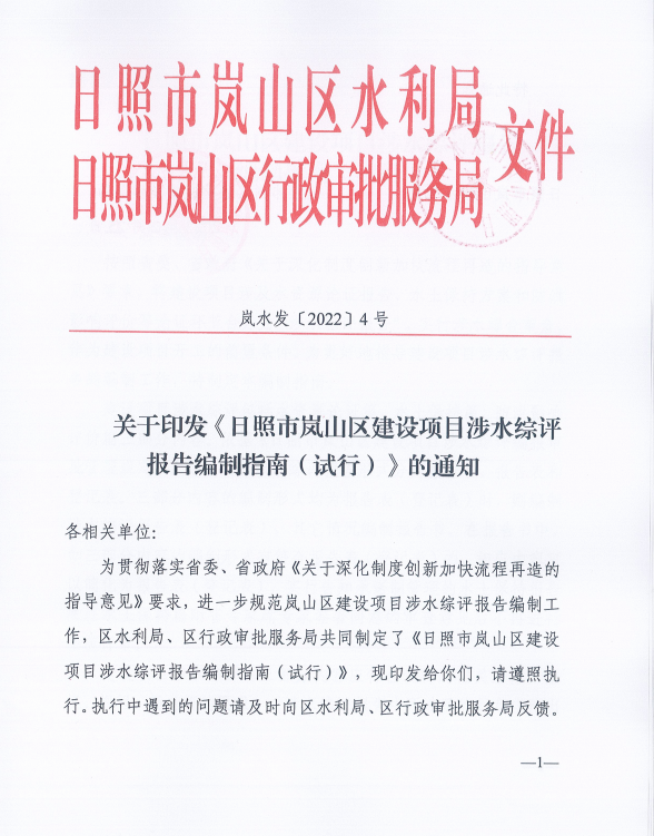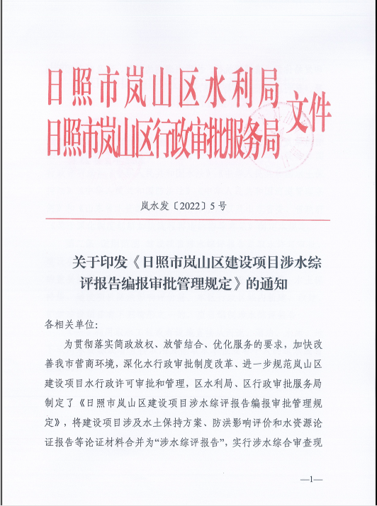 二是推行“三合一”涉水综评报告。为优化营商环境,岚山区水利局会同岚山区审批局联合印发《日照市岚山区建设项目水影响评价编制指南(试行)》和《日照市岚山区建设项目水影响评价报告编报审批管理规定》,在全市创新性的将涉水相关的水土保持、水资源论证、防洪影响评价“三合一”改革成“涉水综评报告”,实行“三合一”审批后,将原有的三个评审环节合并为一个评审环节,一个项目在涉水审批上不再多次评审,将节省三分之二审批时间,既为企业减少时间成本,又为企业减少制度成本,从根本上达到为企业减负的效果。